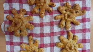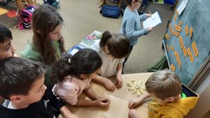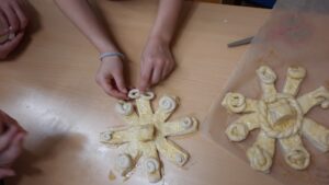 In der Klasse 2b entstand die Idee eigene Mutscheln zu backen. So formten und verzierten einige Tage später an einem Schulmorgen 44 Hände wunderschöne handmade Mutscheln, die im Nachmittagsunterricht von jeder Tischgruppe wieder fröhlich verspielt und gegessen werden konnten.