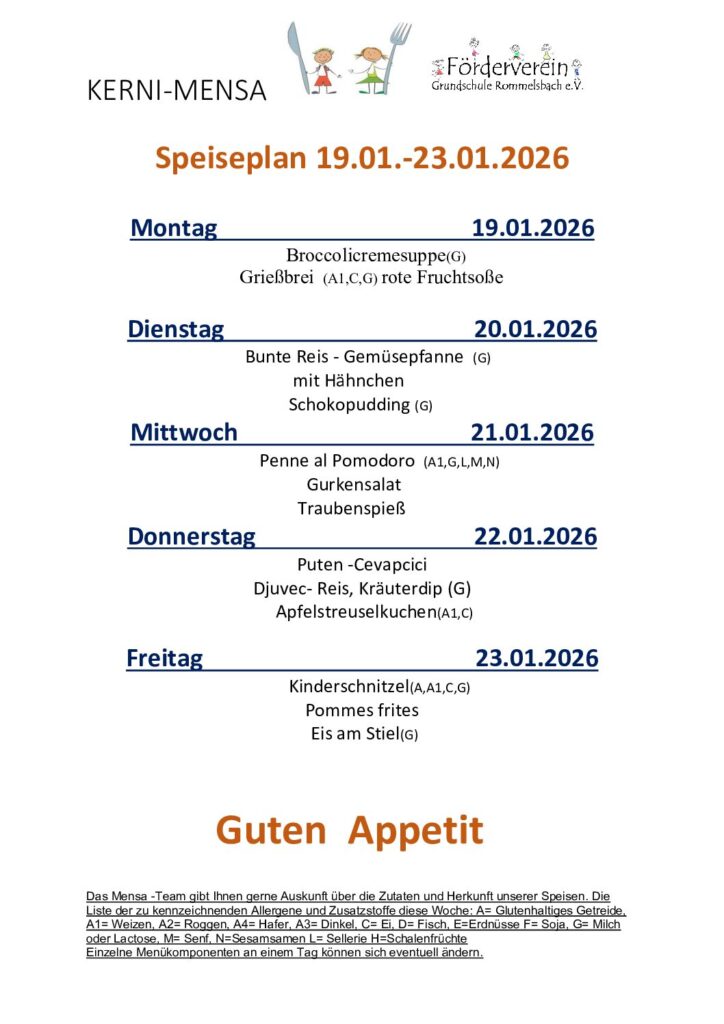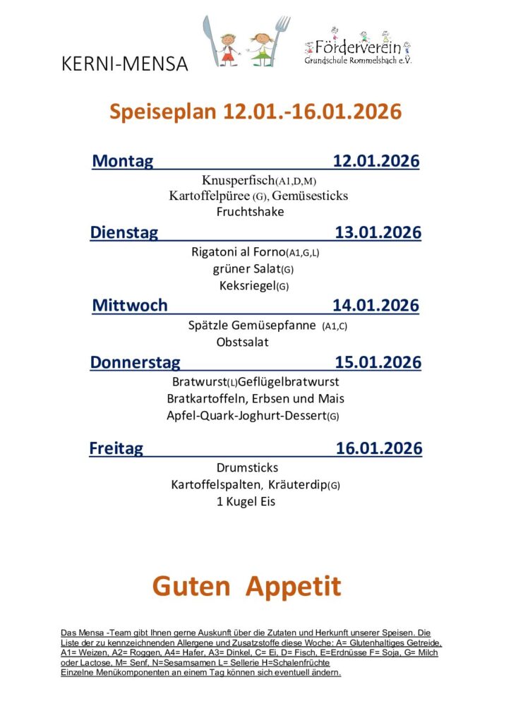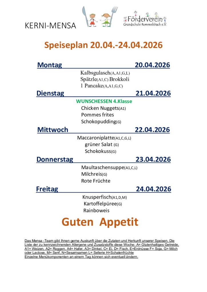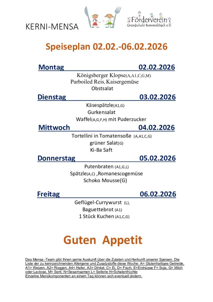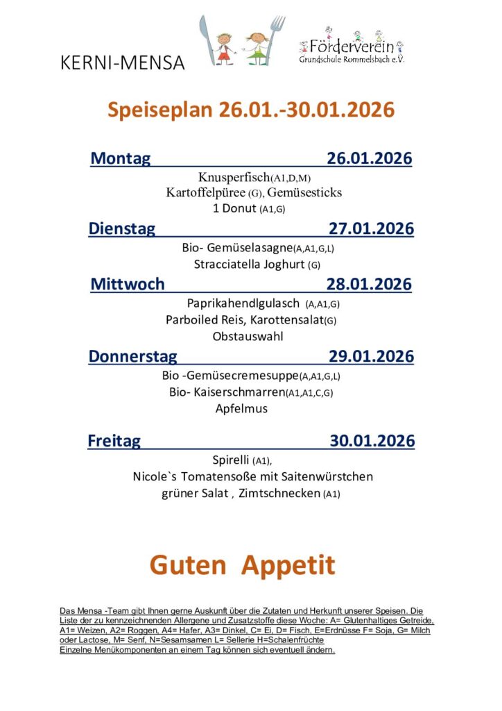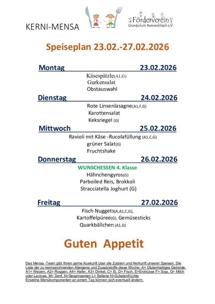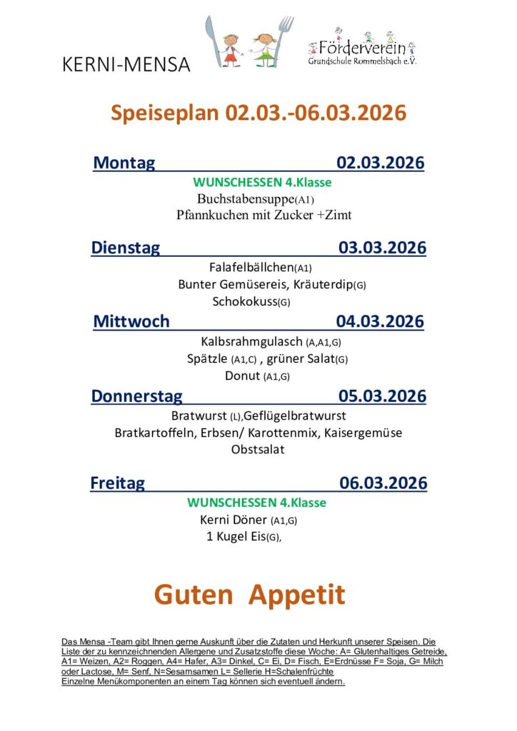 Der Förderverein gibt gerne Auskunft zu den Speisen. Bitte wenden Sie sich an unser Mensapersonal. Ab sofort sind alle unser Speisen nach EU-Verordnung gekennzeichnet. Eine Übersicht finden sie hier: LM-Kennzeichungsverordnung