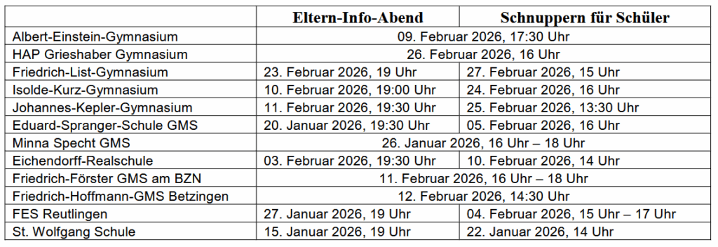 Seit dem Schuljahr 2024/2025 wird in der Klasse 4 in Baden-Württemberg ein neues Aufnahmeverfahren (NAVi 4 BW) umgesetzt. Dadurch ergeben sich auch Neuerungen bei der Grundschulempfehlung und der Wahl der weiterführenden Schulart. Im Folgenden werden Sie in Kürze über die Weiterentwicklung des Übergangsverfahrens informiert und können der Terminübersicht entnehmen, wann die einzelnen weiterführenden Schulen in Reutlingen Informationsveranstaltungen durchführen.